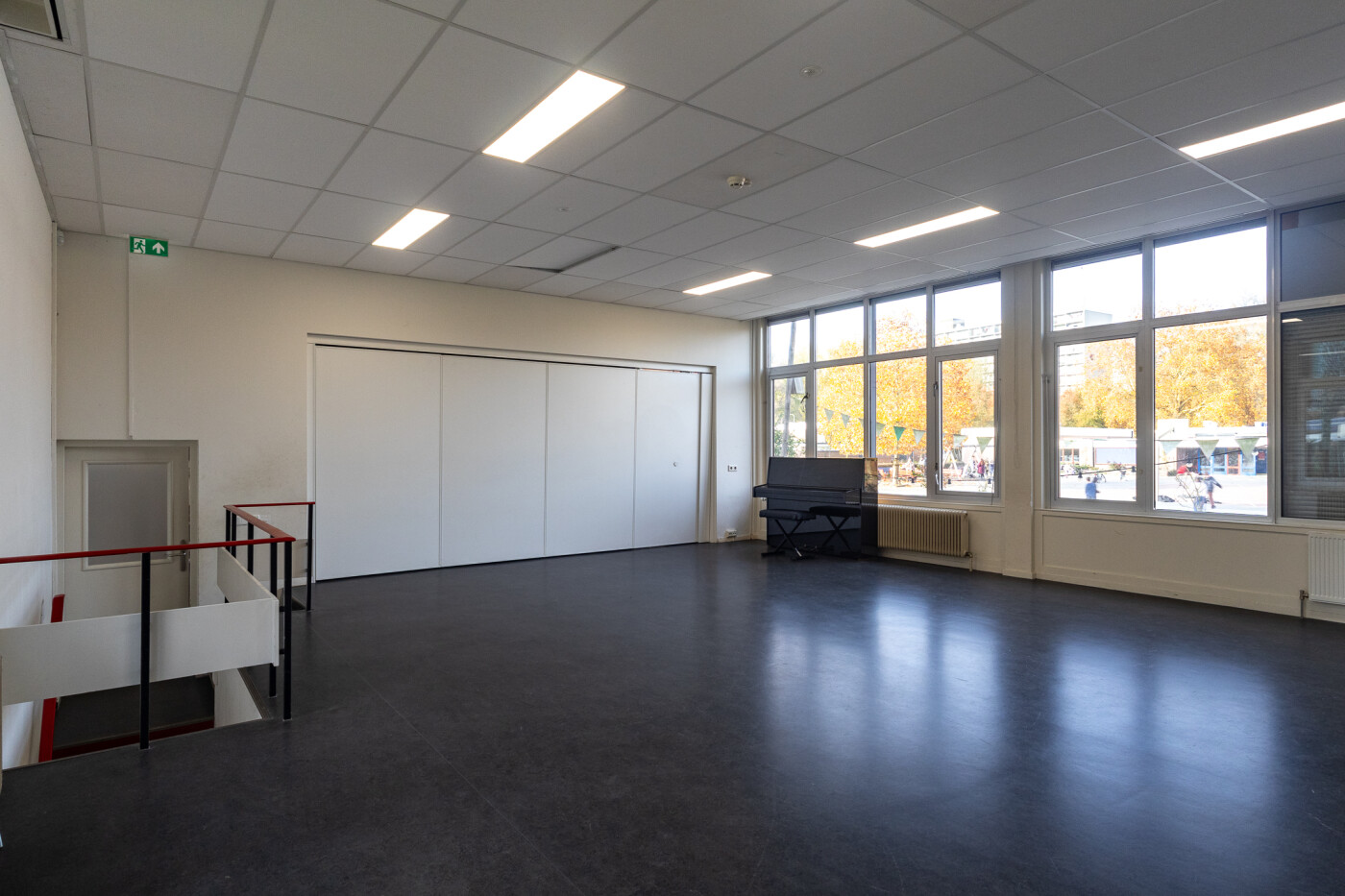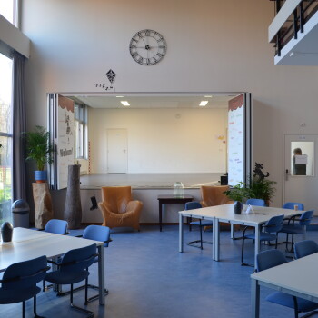 | Accommodatie | De toneel / dansruimte kan worden gebruikt voor activiteiten met geluid zoals toneel/dans/muziek. Er kunnen +/- 20 dansers terecht. Indien gewenst kunnen de schuifwandpanelen naar de aula worden geopend om zo een echt podium te creëren. De aula kan wo |