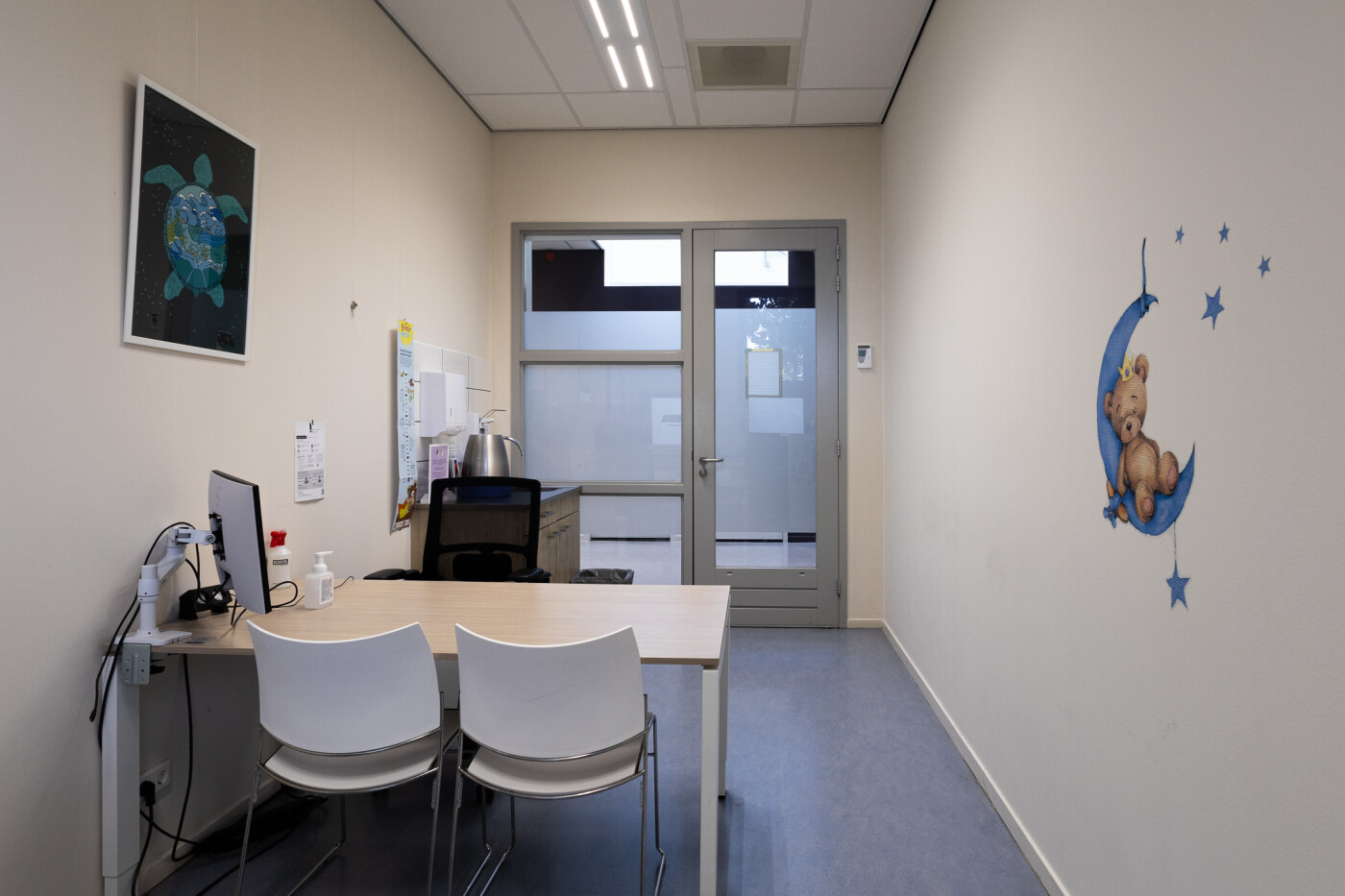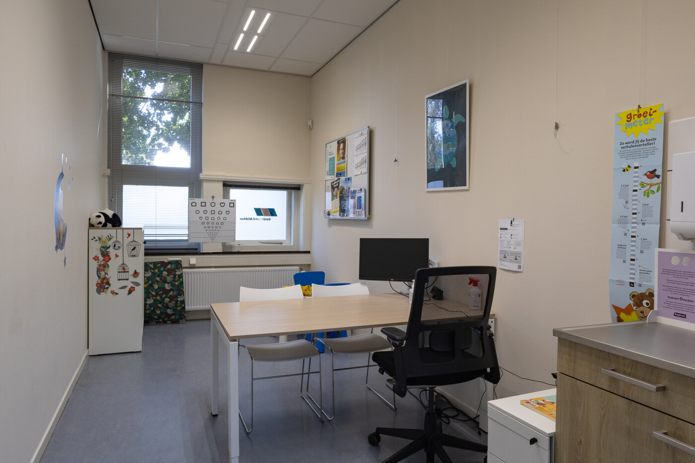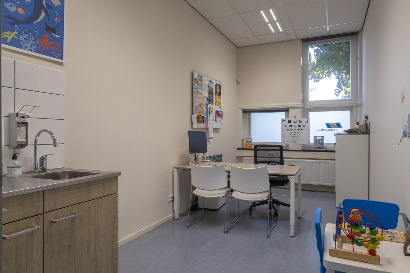 De twee spreekkamers zijn voorzien van een buro en stoelen en een spoelbak. Beide ruimtes zijn geschikt zijn geschikt voor 1-4 personen.
