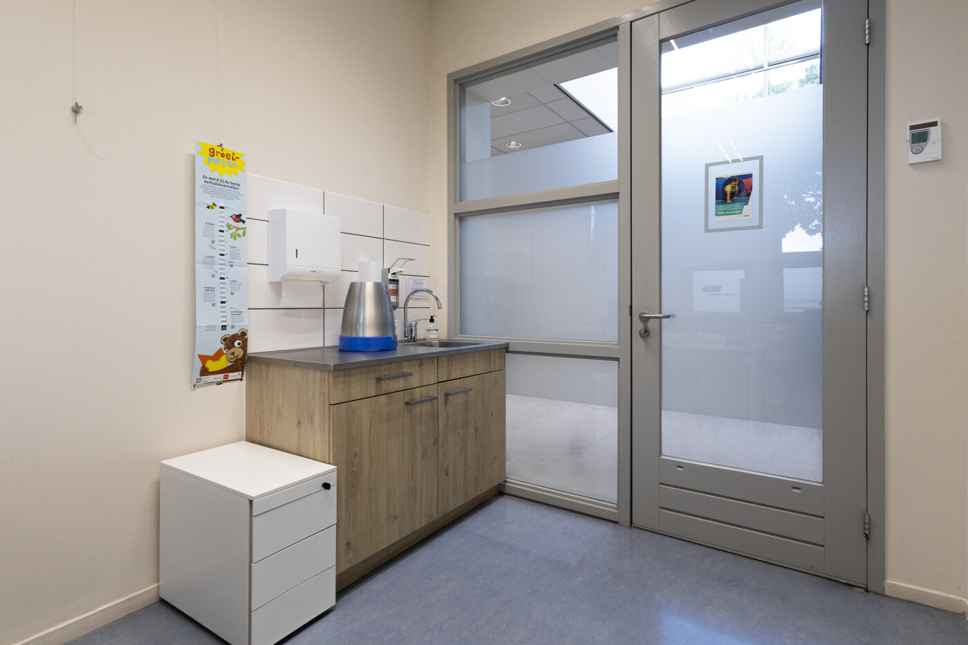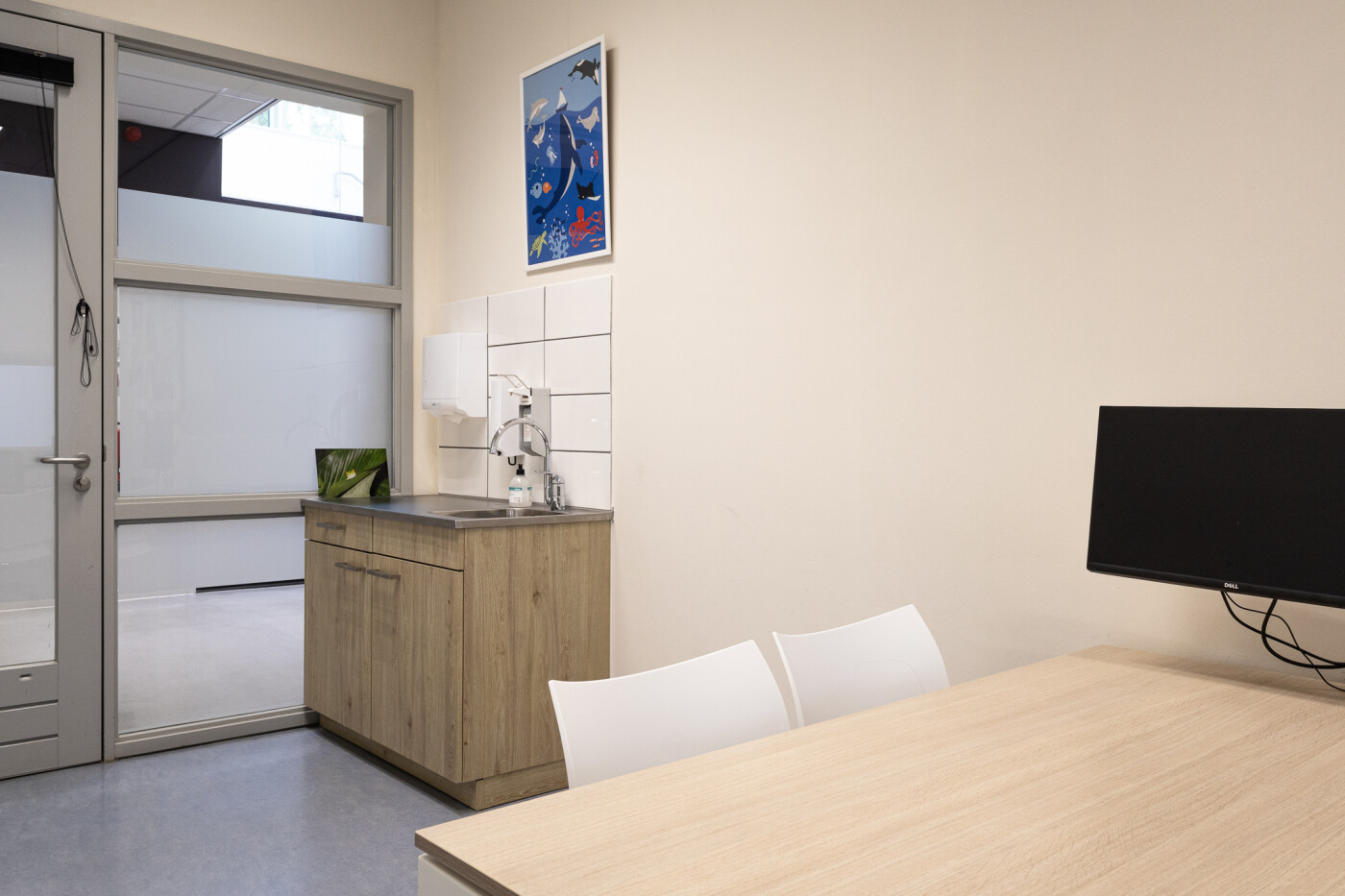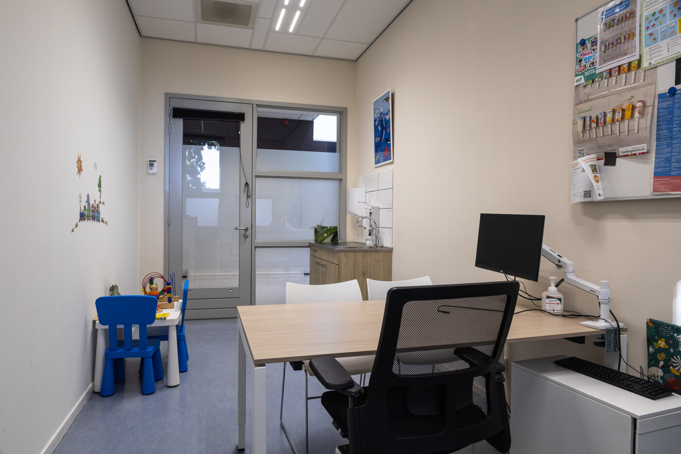 De twee spreekkamers zijn voorzien van een buro en stoelen en een spoelbak. Beide ruimtes zijn geschikt zijn geschikt voor 1-4 personen.