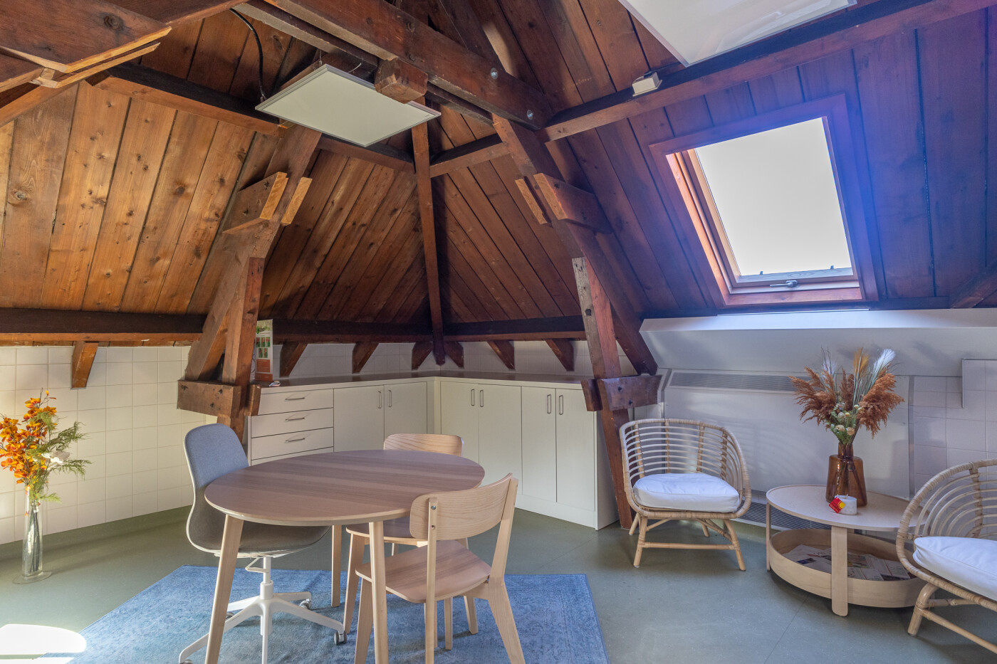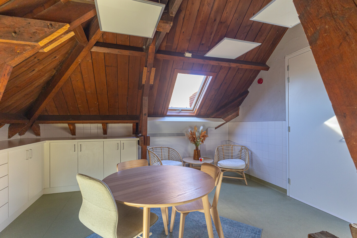 De spreekkamer-vergaderuimte 2.23 is gelegen op de 2e verdieping en is per trap of lift te bereiken. Deze ruimte is geschikt voor max. 5 personen en is ingericht met ronde tafel met stoelen en een zithoekje met 2 fauteuils.